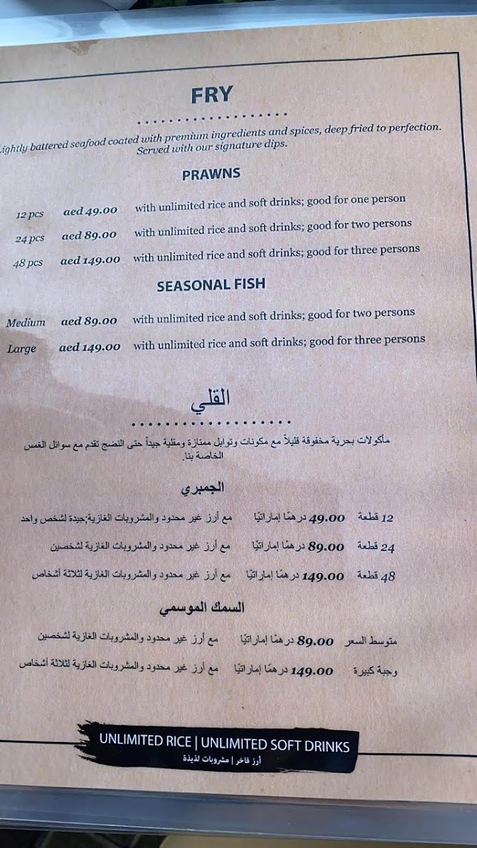 The menu features a variety of grilled and sautéed seafood options, allowing you to experience fresh fish and shellfish prepared in familiar yet nuanced ways. Examples include Garlic Butter Mixed Seafood and the Cajun Seafood Platter, both of which pair well with the serene waterfront atmosphere of Corniche Deira. Whether you prefer delicately grilled salmon, spicy lobsters, or a hearty salmon soup, the food complements a calm, easygoing dining moment.